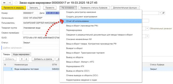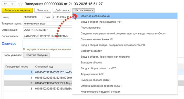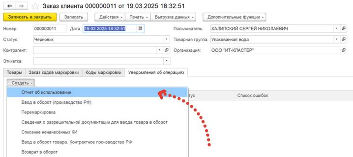 На основании сформированного документа Заказа кодов маркировки создаем документ Уведомления об операциях с типом Отчет об использовании.