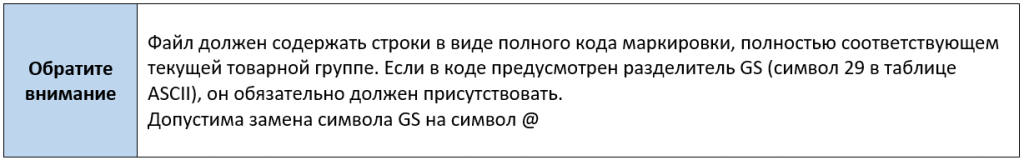 В этом случае потребуется загрузка кодов из текстового файла в документ Заказ кодов маркировки.