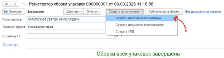 Далее на основании этого документа создаем документ Отчета об использовании.