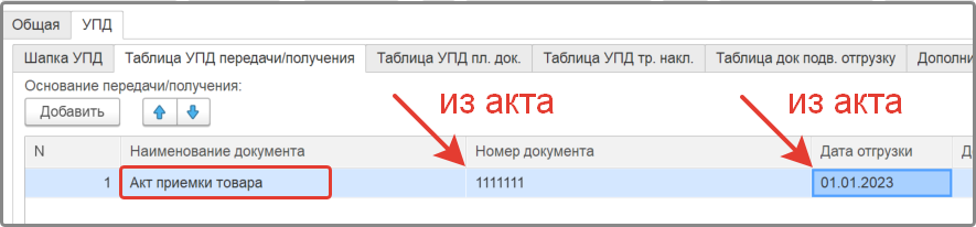 5. В параметрах УПД выберите вкладку Таблица УПЛ передачи/получения, добавьте новую строку и заполните ее в соответствии данными акта.