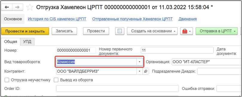 Для предоставления данных об отгрузке товаров в сторону вайлдберриз через конфигурацию Хамелеон ЦРПТ требуется выполнить следующие действия: