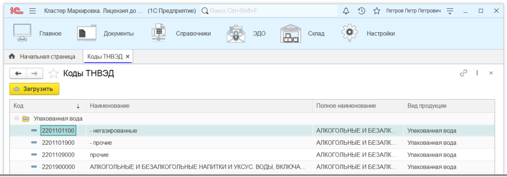 Сначала заходим в справочник Коды ТНВЭД. В левом верхнем углу нажимаем кнопку Загрузить. Будет произведена загрузка кодов ТНВЭД для товарной группы маркированной продукции, выбранной в организации, используемой по умолчанию. При работе с несколькими товарными группами загрузку необходимо выполнить для каждого контура маркированных товаров.