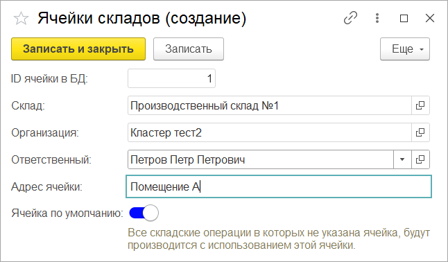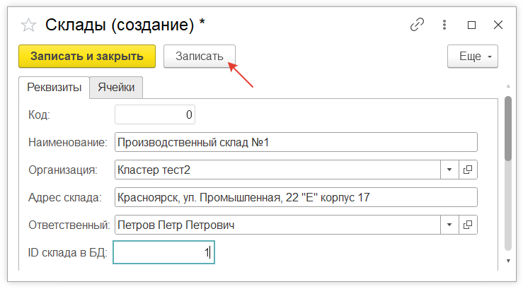 После записи склада перейдите на вкладку Ячейки и добавьте необходимое количество ячеек для данного склада.