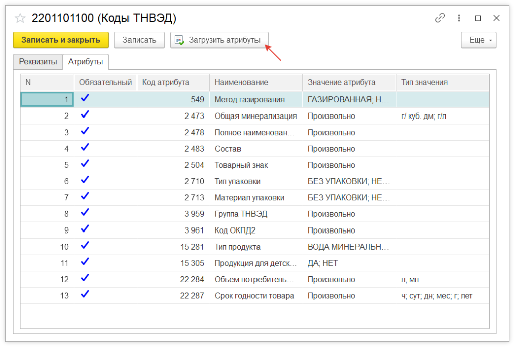 После окончания загрузки кодов ТНВЭД выборочно убедитесь в корректности заполнения справочника на вкладке Атрибуты.