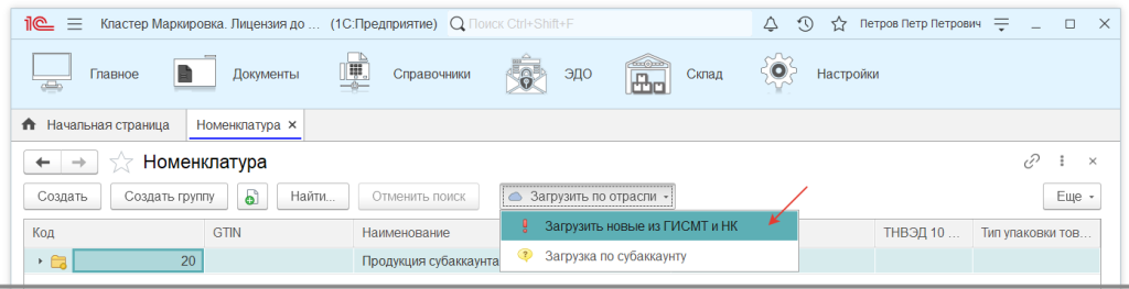 Если в вашем личном кабинете Национального каталога имеются карточки товаров, их можно загрузить в справочник Номенклатура. Для этого откройте справочник и нажмите Загрузить по отрасли --> Загрузить из ГИСМТ и НК. Если вы работаете с несколькими ТГ, загрузку необходимо выполнить для каждой товарной группы отдельно.