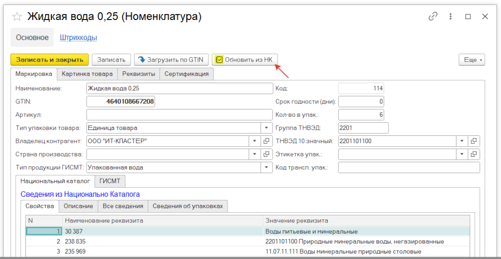 Ключевым полем в карточке товара является GTIN. Не меняйте его. Остальную информацию в справочнике можно править вручную. При необходимости данные карточки можно синхронизировать с Национальным каталогом маркированных товаров. Для этого достаточно нажать кнопку Обновить из НК.