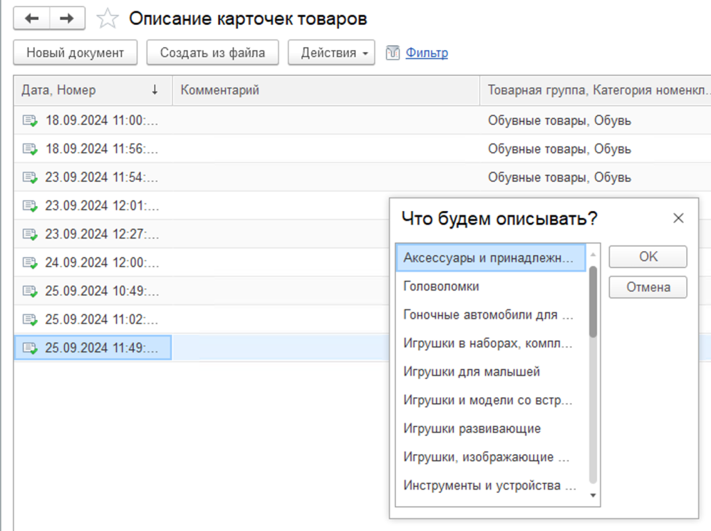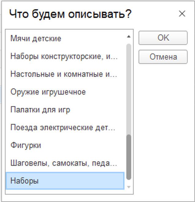 Наборы описываются так же как и единицы, вручную или из файла. При создании вручную нужно выбрать строку Наборы при создании документа, а для создания из файла потребуется шаблон описания набора.Обращаем внимание, что не все товарные группы поддерживают наборы.