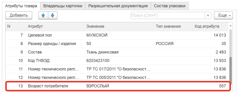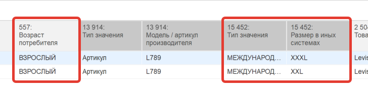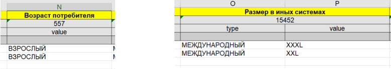 Добавляем новую колонку в любое место шаблона (кроме самой первой). Важно правильно заполнить первые три строчки. Первая строка – наименование атрибута (Возраст потребителя), вторая – код реквизита (557), третья, вид значения (value). Обратите внимание, что атрибуты с указанием типа значения подразумевают добавление дополнительной колонки с видом type.