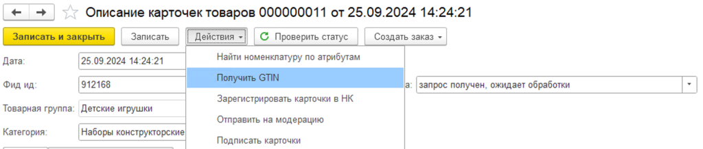 После получения GTIN нажимаем кнопку Действия – Зарегистрировать карточки в НК. Будет создано задание в НК. Чтобы следить за ходом его выполнения, нажимаем кнопку Проверить статус.