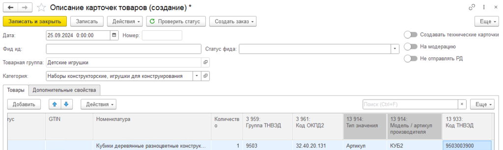 В заполненном документе проверяем, верно ли определена товарная группа. Если требуется создание технических карточек, ставим соответствующую галку.