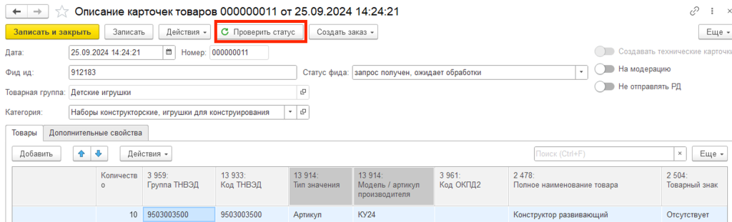 При возникновении ошибок статус изменится на Запрос не принят, а в строках товара появится описание ошибок.