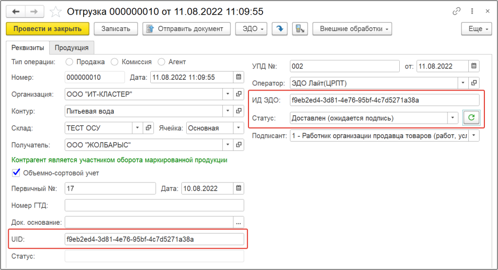 Результатом успешной отправки документа будет заполнение полей ИД ЭДО и UID. Следить за статусом отправленного документа можно используя кнопку Обновить статус.