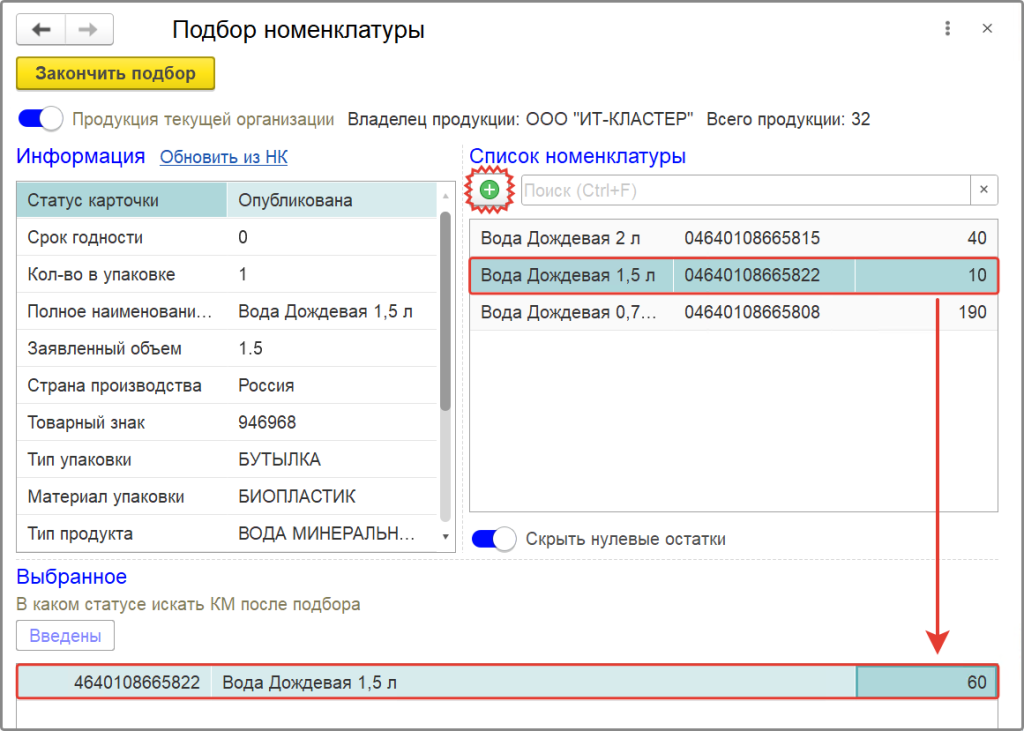 Введите необходимое количество продукции в нижней части формы подбора (таблица Выбранное). Обратите внимание на остатки продукции, добавить большее количество, чем на остатках не удастся. Нажмите кнопку Закончить подбор. Выбранная продукция будет перенесена в документ. При необходимости, подбор можно повторить или скорректировать (до отправки документа) повторным нажатием кнопки Добавить номенклатуру.