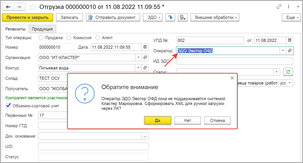 В случае, если выбран оператор, для которого интеграция пока не реализована, при попытке отправки документа будет предложено сохранить файл в XML-формате. Сохраните файл на ваш жесткий диск и в личном кабинете вашего оператора ЭДО загрузите данный файл, используя функцию импорт документа из XML.