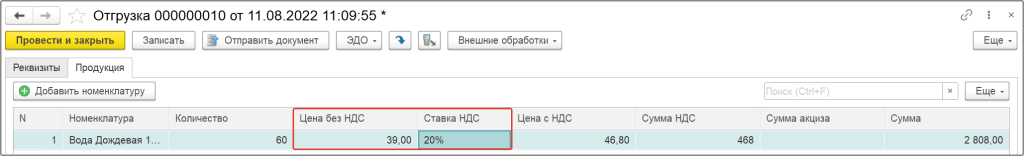 После подбора номенклатуры заполните цену без НДС и процентную ставку НДС для каждой строки, остальные поля будут заполнены автоматически.