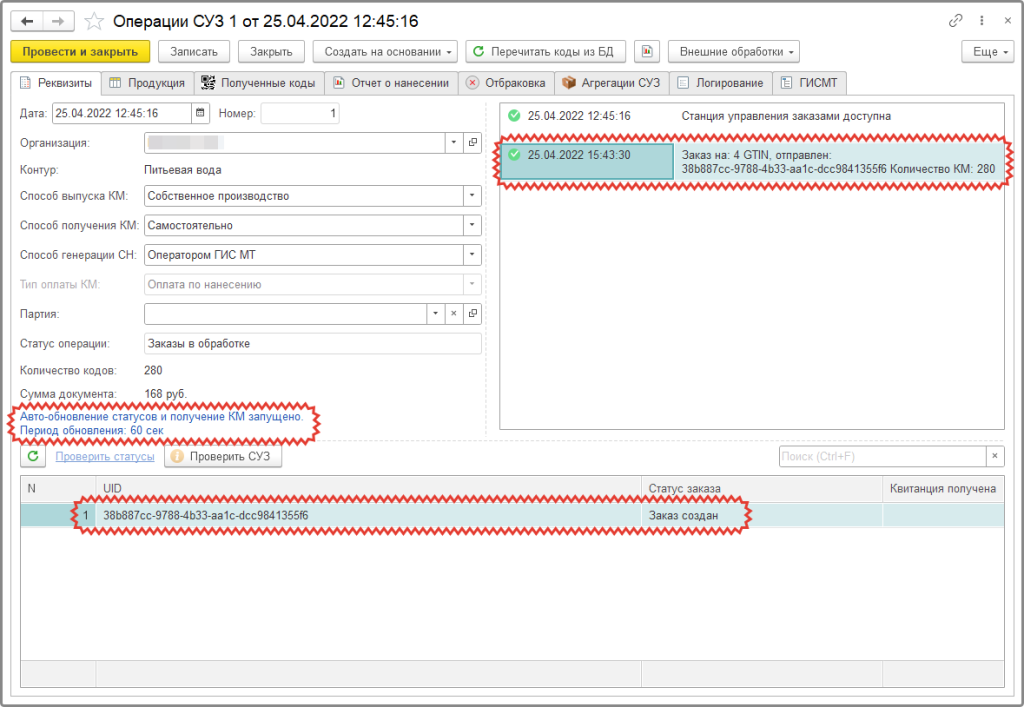 При успешной отправке заказа будут получены идентификаторы документов заказа и выведено соответствующее уведомление в таблице статусов. Запустится автоматический опрос статусов заказа с определенным периодом, полученным от СУЗ. По получению всеми заказами статуса "Заказ готов" будет произведено получение кодов идентификации в БД и закрытие заказов в СУЗ.