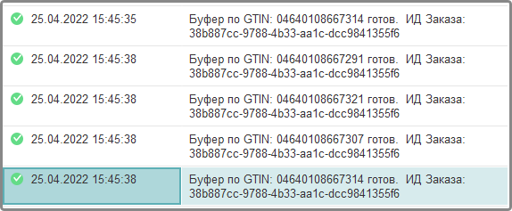 В таблице уведомлений должны появиться записи о готовности буферов с кодами идентификации по каждому GTIN из заказа. Не рекомендуется запускать получение кодов, не дождавшись готовности буферов по каждому GTIN.