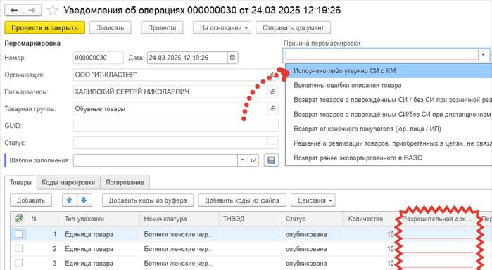 4. Открываем созданный документ, заполняем причину перемаркировки и разрешительную документацию для каждого товара.