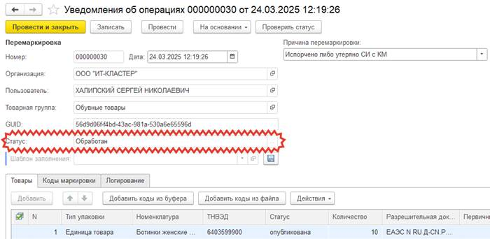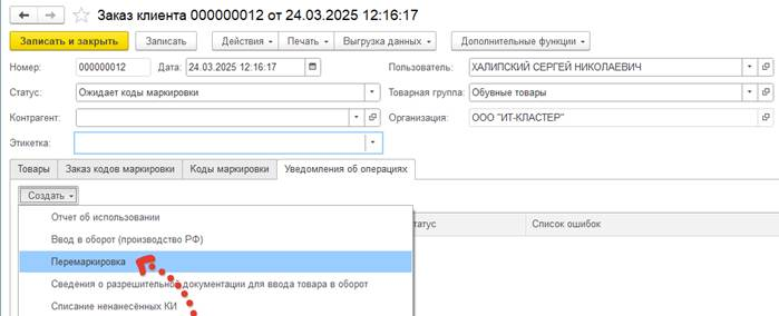 3. Отправляем документ заказа марок, получаем коды маркировки. На вкладке Уведомления об операциях нажимаем Создать – Перемаркировка.