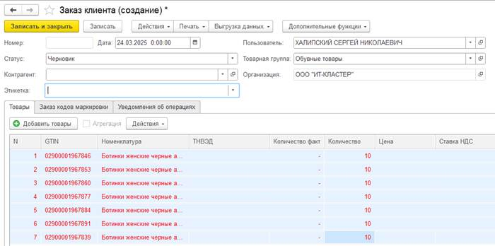 1. Создаем документ Заказ клиента и указываем в нем список товаров, подлежащих перемаркировке.