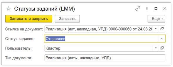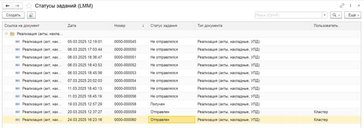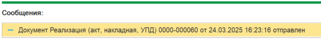 «Документ Реализация (акт, накладная, УПД) YYYY-000XXX от 01.01.2025 16:00:00 отправлен»