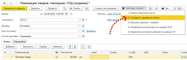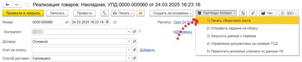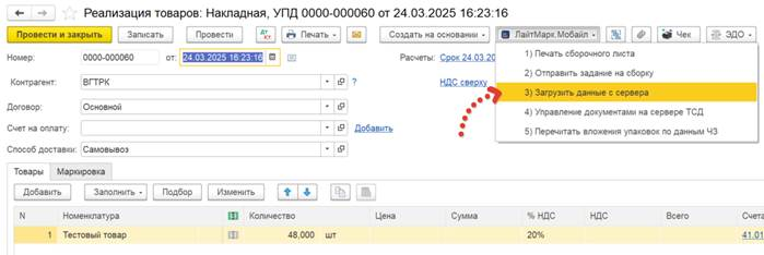 Открываем документ, из которого было сформировано задание на сборку и нажимаем кнопку Загрузить данные с сервера.