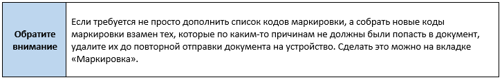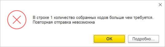 1) Документ не выгружается, выдается сообщение об ошибке: «В строке X количество собранных кодов больше чем требуется. Повторная отправка невозможна»