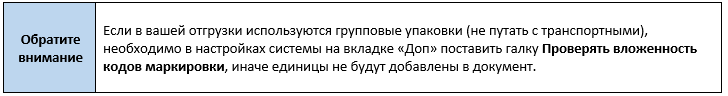 Сканировать в документ сборки отгрузки можно как единицы товара, так и коды упаковок. Количество уровней вложенности не ограничено. Если планируется сканирование упаковок, необходимо в настройках системы на вкладке «Доп» установить галку Авторизация через прокси.