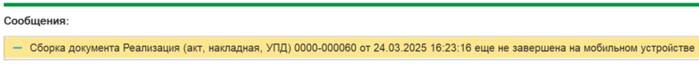 2) При нажатии на кнопку Загрузить данные с сервера выдается сообщение «Сборка документа XXX еще не завершена на мобильном устройстве»