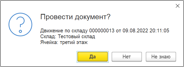 Обратите внимание, что документ поступления будет создан для комбинации склад/ячейка, указанным в реквизитах документа ввода в оборот. При необходимости этот склад можно изменить, нажав кнопку Нет при запросе на проведение документа поступления.