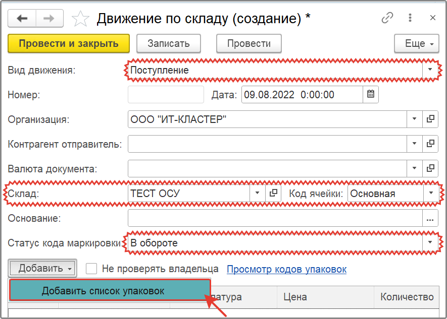 Заполните поля Склад, Ячейка и Статус кода маркировки. Для добавления кодов маркировки необходимо использовать кнопку "Добавить список упаковок".