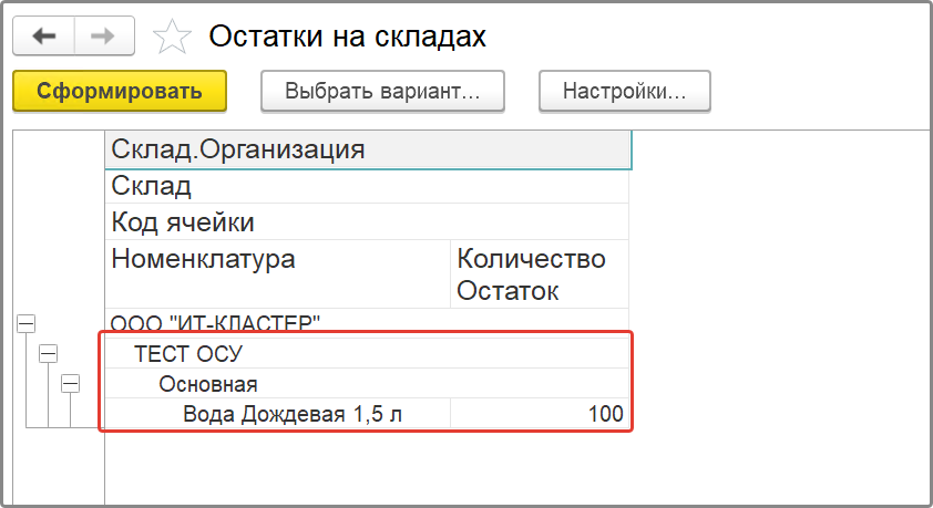 Для завершения операции поступления маркированных товаров на склад ОСУ необходимо провести документ. Актуальность остатков на складе можно просмотреть в отчете Остатки на складах.