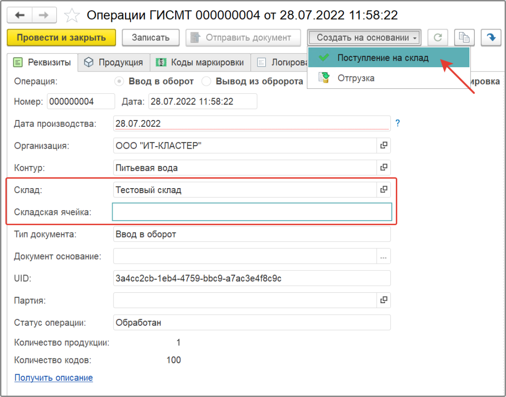 В обработанном документе Операции ГИСМТ с типом Ввод в оборот нажмите Создать на основании -- Поступление на склад.
