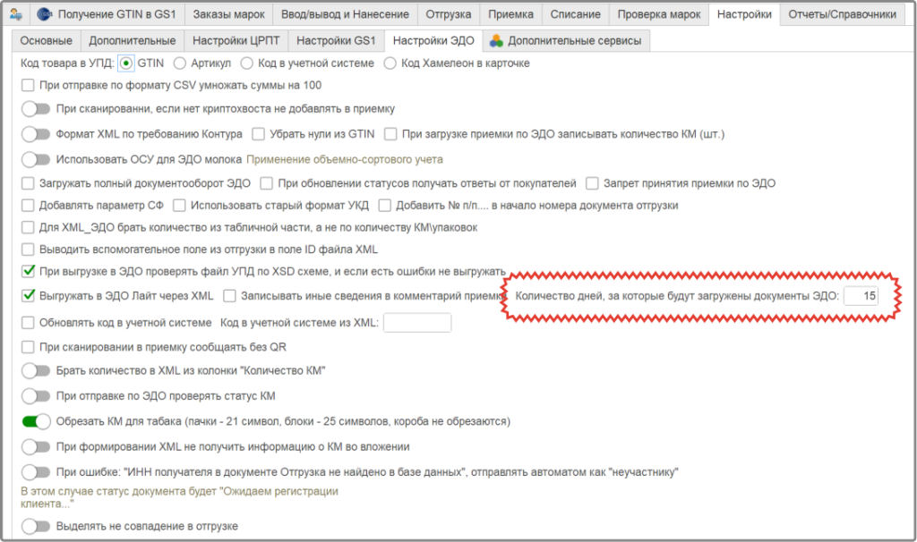 Обратите внимание, что по умолчанию загружаются последние неподписанные документы за 15 дней. Если необходимо выгрузить более старые документы, отредактируйте данный параметр в настройках ЭДО Хамелеон ЦРПТ.