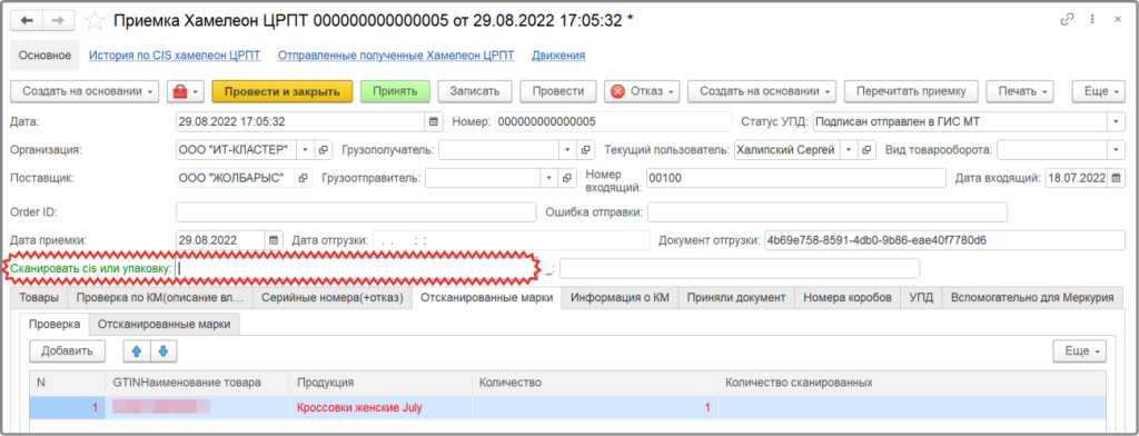 В документе приемки есть возможность сверки фактически полученных кодов с кодами в УПД. Для этого отсканируйте коды с полученных товаров в поле CIS (см. скриншот). Все расхождения будут помечены красным цветом.