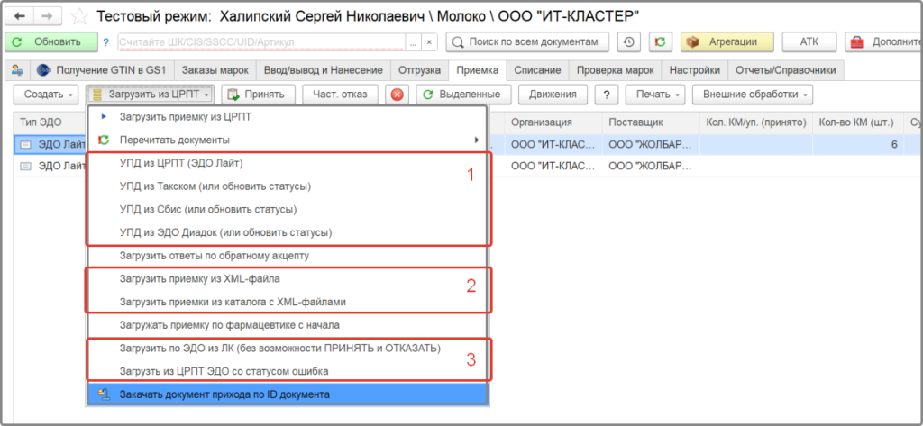 На вкладке Приемка выберите подменю Загрузить из ЦРПТ