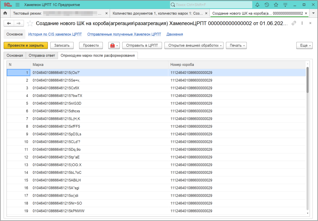 В обоих случаях мы получаем документ разагрегации со списком УИТУ. После того, как докумен будет обработан, все марки, указанные на вкладке "Оприходуем марки после расформирования", будут доступны для добавления в документы.