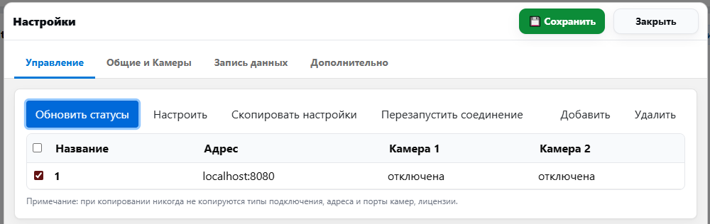 - После копирования камеры “молчат”. На приёмнике выполните Перезапустить соединение; проверьте индивидуальные адреса/порты камер — они не копировались и должны быть заданы верно.