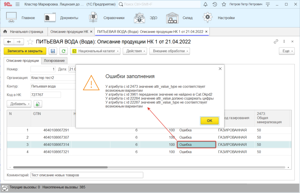 Исправьте значение полей и повторно отправьте документ, нажав Национальный каталог --> Создать карточки в НК.