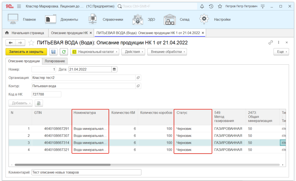 В случае успешной обработки документа будут созданы карточки в системе Кластер Маркировка в справочнике Номенклатура. Статус карточки будет "Черновик".