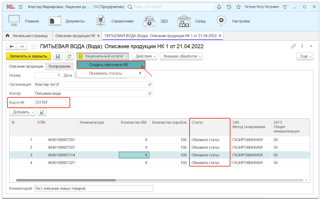Внимательно проверьте всю информацию перед отправкой и нажмите кнопки Национальный каталог --> Создать карточки в НК.