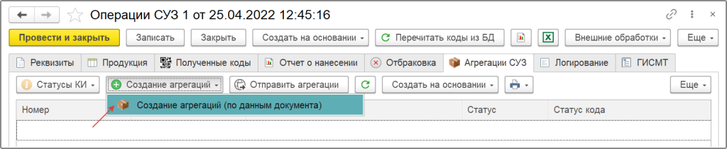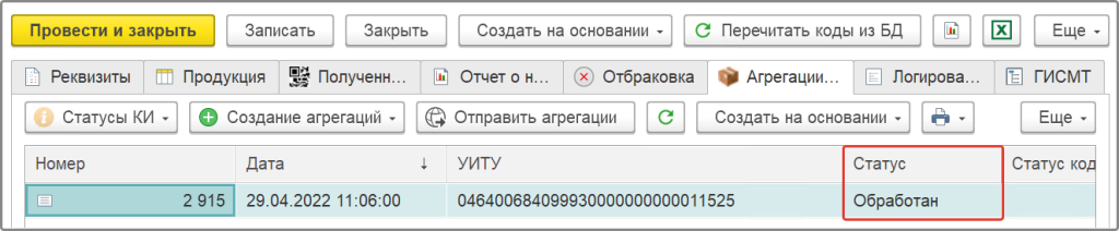 Зарегистрированные агрегации можно ввести в оборот документом Операции ГИСМТ. Для этого на этой же вкладке нажмите Создать на основании --> Ввод в оборот.