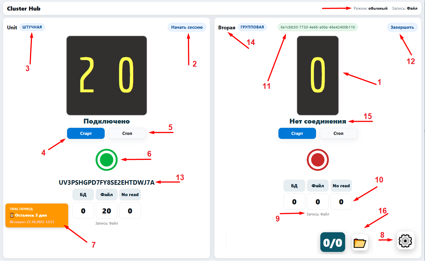 • Строка статуса камеры: Под счетчиком отображается состояние подключения камеры (например, «Ожидание подключения» при отсутствии соединения или «Подключено» при успешном подключении). Если связь с камерой теряется, статус изменится, и система предпримет автоматическое переподключение (рисунок 1 п.15).