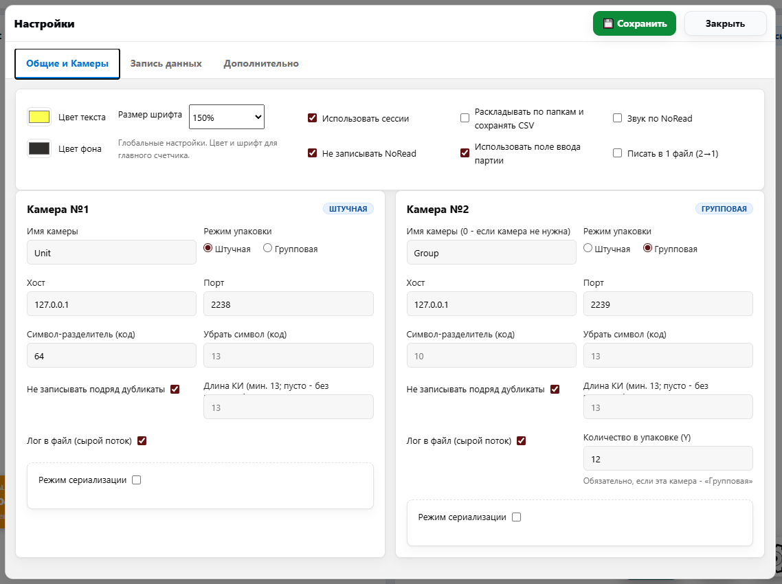 • Название и режим камеры: Каждая камера отображается в отдельной панели с заголовком, содержащим имя камеры (например, “Камера №1” или заданное пользователем имя) и бейдж режима (например, «ШТУЧНАЯ» для построчного сканирования или «ГРУППОВАЯ» для групповой упаковки рисунок 1 п.3). Эти названия соответствуют полям «Имя камеры» и «Режим упаковки» в настройках (рисунок 1 п.14).