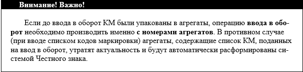 Для того чтобы успешно ввести в оборот список товаров, объединенных в агрегат, достаточно создать документ ввода в оборот на основании успешно обработанного документа агрегации.