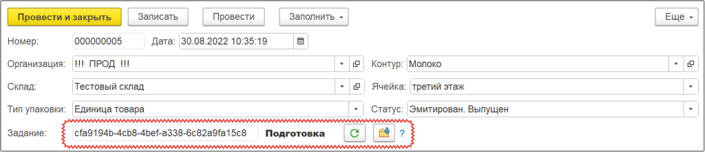 После успешной отправки задания его идентификатор и статус отразится на форме документа.