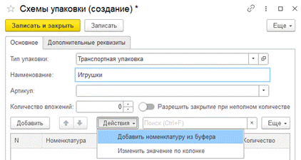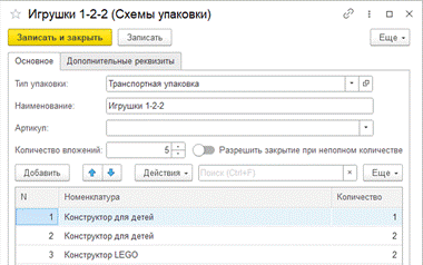 Создаем или выбираем существующую схему транспортной упаковки, для которой не указано строгое соответствие количества вложений.