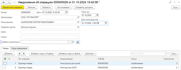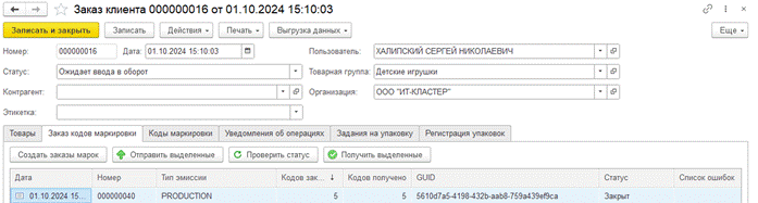 Если используется схема с фиксированным количеством вложений, то количество кодов маркировки к заказу будет пересчитано пропорционально вложений и количеству упаковок. Вручную корректировать количество кодов единиц товаров запрещено.