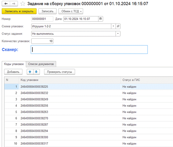 На вкладке Задания на упаковку будут выведен список заданий, по одному для каждой схемы упаковки.