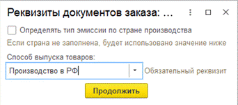 Статус заказа должен быть Черновик или Ожидает производства. Переходим на вкладку Заказ кодов маркировки и нажимаем кнопку Создать заказы марок. Появится окно выбора типа эмиссии.